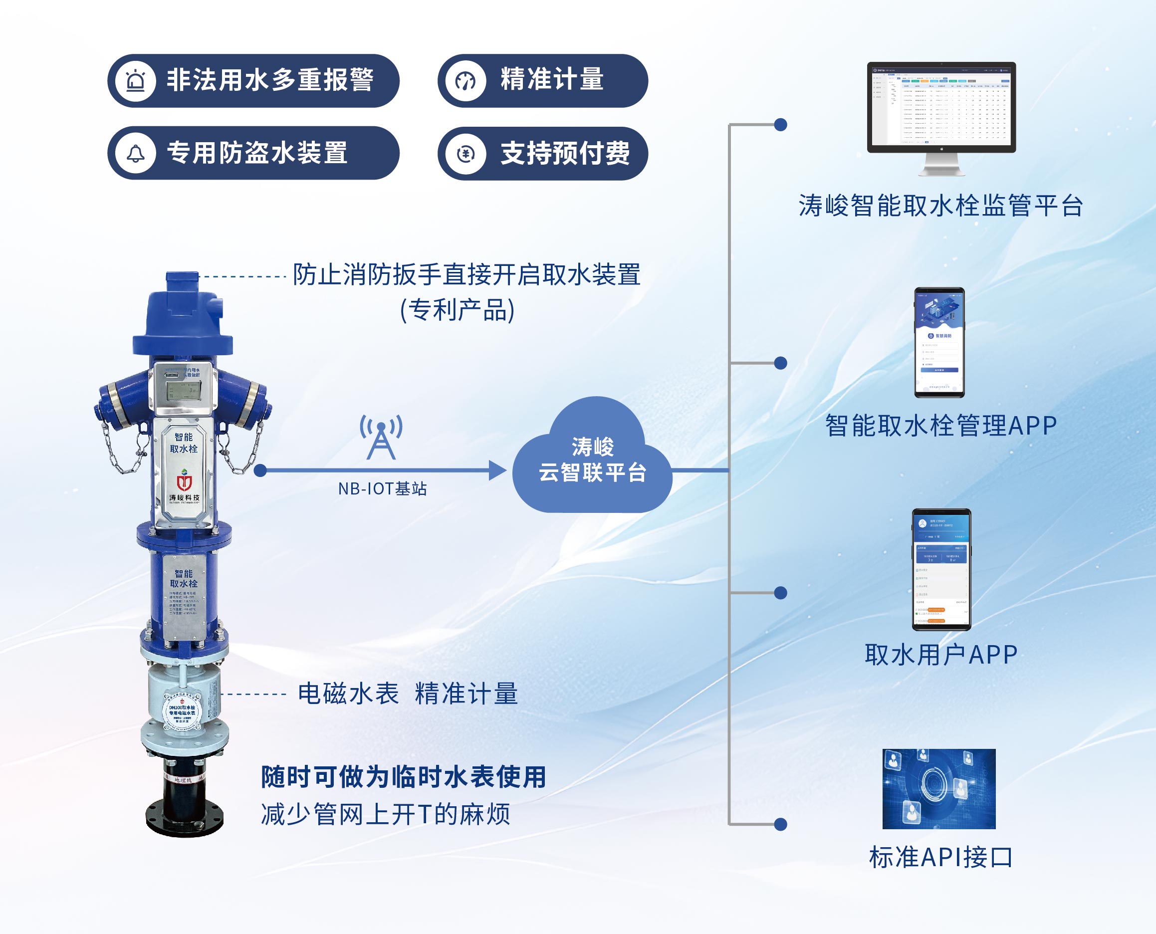 隨著城市化進(jìn)程的加速和環(huán)境治理的不斷提升,環(huán)衛(wèi)降塵、園林綠化、市政建設(shè)等用水需求量持續(xù)增大。傳統(tǒng)上,環(huán)衛(wèi)、綠化等用水主要依賴市政消防栓,部分消防栓未安裝水表,導(dǎo)致用水量無法計量的問題。 為了解決這一問題,湖南濤峻自主研發(fā)生產(chǎn)了一款智能取水栓。采用超低功耗微機(jī)控制器為大腦,結(jié)合高可靠性壓力傳感器、角度傳感器、北斗模塊、電磁水表(精準(zhǔn)計量)等智能部件,通過低功耗物聯(lián)網(wǎng)通訊技術(shù)將取水栓的狀態(tài)信息、用水量、水壓等數(shù)據(jù)通過物聯(lián)網(wǎng)媒介傳輸給監(jiān)控中心,實現(xiàn)對取水栓狀態(tài)以及用水?dāng)?shù)據(jù)的實時監(jiān)控。