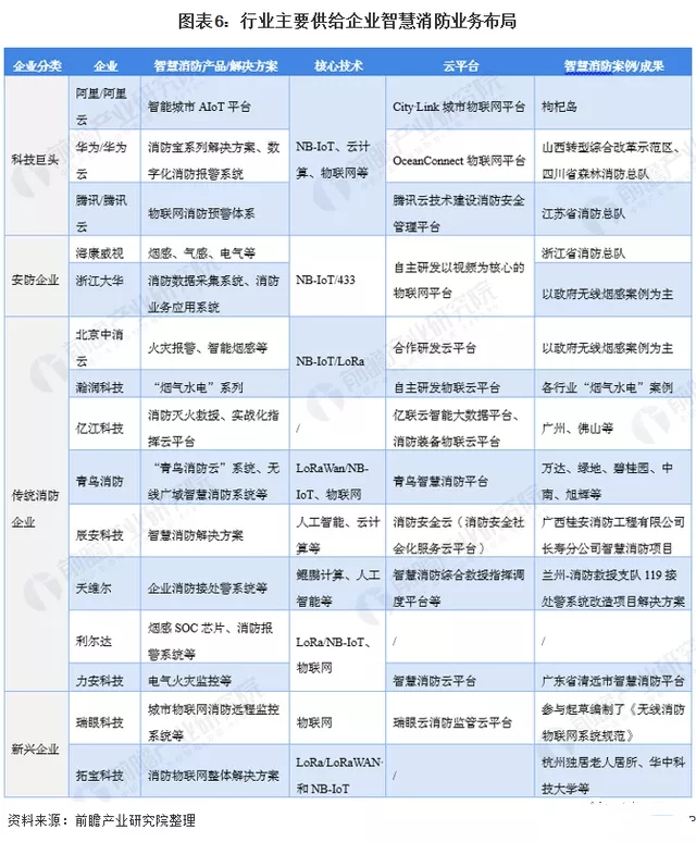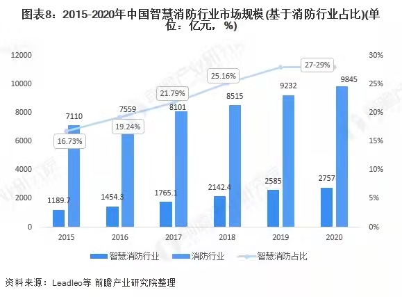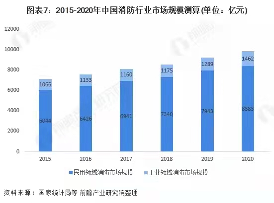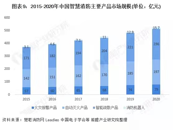 產(chǎn)業(yè)發(fā)展歷程:主要經(jīng)歷了智慧城市概念導(dǎo)入和智慧消防發(fā)展兩個(gè)階段 我國智慧消防的發(fā)展主要經(jīng)歷了兩個(gè)階段:智慧城市概念導(dǎo)入和智慧消防發(fā)展期。國內(nèi)智慧消防起步比國外稍晚幾年,在消防產(chǎn)業(yè)由傳統(tǒng)消防向智慧消防轉(zhuǎn)型升級(jí)過程中,雖然面臨著巨大的挑戰(zhàn),但在政策、經(jīng)濟(jì)、技術(shù)等因素的驅(qū)動(dòng)下,智慧消防將繼續(xù)向縱深發(fā)展。 ![]() 產(chǎn)業(yè)發(fā)展現(xiàn)狀 1、供給:參與者主要分為四大類型 當(dāng)前,智慧消防已經(jīng)成為整個(gè)消防產(chǎn)業(yè)的主流與風(fēng)口,消防產(chǎn)業(yè)對(duì)于新技術(shù)的需求,也讓眾多科技企業(yè)加入智慧消防布局。智慧消防市場(chǎng)存在四大玩家:傳統(tǒng)消防企業(yè)、安防企業(yè)、科技巨頭、創(chuàng)業(yè)公司。 ![]() 2、需求:智慧消防滲透率逐年上升,市場(chǎng)規(guī)模不斷增長 根據(jù)消防產(chǎn)品的使用領(lǐng)域,可將消防產(chǎn)品市場(chǎng)劃分為民用建筑消防市場(chǎng)、工業(yè)(行業(yè))安全裝備應(yīng)用市場(chǎng)和消防部隊(duì)裝備市場(chǎng)。 從民用領(lǐng)域來看,根據(jù)《建筑設(shè)計(jì)防火規(guī)范GB 50016-2014》規(guī)定及其他相關(guān)設(shè)計(jì)規(guī)定與行業(yè)經(jīng)驗(yàn),在住宅建筑方面消防投入約占建筑總投資的5%,在辦公與商業(yè)建筑方面消防投入約占建筑總投資的8%-10%。前瞻結(jié)合我國房地產(chǎn)開發(fā)住宅投資額、房地產(chǎn)開發(fā)辦公樓投資額、房地產(chǎn)開發(fā)商業(yè)營業(yè)用房投資額,按照住宅5%、辦公樓和商業(yè)營業(yè)用房8%的消防投入占比保守估算,2020年中國民用領(lǐng)域消防市場(chǎng)規(guī)模約為8383億元。 從工業(yè)領(lǐng)域來看,一般工業(yè)領(lǐng)域消防投入占行業(yè)固定資產(chǎn)投資支出的比例在3%左右,前瞻結(jié)合工業(yè)領(lǐng)域固定資產(chǎn)投資額測(cè)算,2020年中國工業(yè)領(lǐng)域消防市場(chǎng)規(guī)模約為1462億元。 ![]() 基于前文測(cè)算數(shù)據(jù)顯示,2015-2020年,我國消防行業(yè)整體市場(chǎng)規(guī)模由7110億元增長至9845億元,年均復(fù)合增長率達(dá)到6.7%。根據(jù)Leadleo數(shù)據(jù)顯示,中國智慧消防行業(yè)的市場(chǎng)規(guī)模處于持續(xù)上升狀態(tài),自2015年1189.7億元提高至2018年2142.4億元。由此可見,智慧消防行業(yè)在整體消防行業(yè)中的滲透率呈上升趨勢(shì),估算2019-2020年在27-29%左右。按照中間值28%的滲透率測(cè)算,2020年中國智慧消防行業(yè)市場(chǎng)規(guī)模約為2757億元,2015-2020年年均復(fù)合增長率為18.3%。 ![]() 2、主要細(xì)分產(chǎn)品:市場(chǎng)規(guī)模超過2000億 前瞻結(jié)合慧聰消防網(wǎng)公布的各消防子細(xì)分市場(chǎng)/產(chǎn)品在消防行業(yè)中的占比,以及前文測(cè)算消防行業(yè)市場(chǎng)規(guī)模,測(cè)算2020年火災(zāi)報(bào)警產(chǎn)品市場(chǎng)規(guī)模約為79億元,自動(dòng)滅火產(chǎn)品市場(chǎng)規(guī)模約為197億元,智能疏散產(chǎn)品市場(chǎng)規(guī)模約為236億元。綜上,2020年,智慧消防主要產(chǎn)品市場(chǎng)規(guī)模達(dá)到528億元。 ![]() 從整體消防市場(chǎng)來看,火災(zāi)報(bào)警、自動(dòng)滅火等產(chǎn)品約占消防市場(chǎng)四分之一左右。假設(shè)智慧消防市場(chǎng)結(jié)構(gòu)與消防行業(yè)類似,其中產(chǎn)品市場(chǎng)占比為25%,測(cè)算2020年整體市場(chǎng)規(guī)模約為2111億元。結(jié)合基于消防行業(yè)占比所得智慧消防規(guī)??芍?,目前中國智慧消防行業(yè)市場(chǎng)規(guī)模超過2000億元,且市場(chǎng)逐步擴(kuò)張,智慧消防平臺(tái)建設(shè)在消防行業(yè)中的滲透率穩(wěn)步提升。 ![]() 產(chǎn)業(yè)競爭格局 1、區(qū)域競爭:招投標(biāo)區(qū)域市場(chǎng)較為分散 在2017年公安部消防局發(fā)布《關(guān)于全面推進(jìn)“智慧消防”建設(shè)的指導(dǎo)意見》之前,公安部消防局已經(jīng)開始籌劃智慧消防的建設(shè)。最早布局的是湖北省宜昌市,安徽省蕪湖市,江蘇省無錫市。此后,智慧消防行業(yè)招投標(biāo)市場(chǎng)迅速擴(kuò)張。根據(jù)前瞻不完全匯總,2019年全國及地方共有34個(gè)智慧消防中標(biāo)項(xiàng)目,2020年共有27個(gè)中標(biāo)項(xiàng)目。截至2021年6月17日,智慧消防行業(yè)中標(biāo)項(xiàng)目數(shù)量達(dá)到25個(gè)。目前行業(yè)的招投標(biāo)競爭焦點(diǎn)主要集中在政府項(xiàng)目上,政府項(xiàng)目主要為兩種,一種是智慧消防平臺(tái)招標(biāo),以定制化項(xiàng)目為主,另一種是地方政府對(duì)無線煙感、電氣等產(chǎn)品和平臺(tái)的采購招標(biāo)。 從我國智慧消防招投標(biāo)項(xiàng)目區(qū)域競爭格局來看,市場(chǎng)整體較為分散,其中,2018-2021年云南地區(qū)智慧消防項(xiàng)目中標(biāo)金額占比達(dá)23%,排名第一;其次為廣東省,占比達(dá)13%;浙江地區(qū)排名第三,智慧消防項(xiàng)目中標(biāo)金額占比達(dá)12%。 ![]() 注:2021年數(shù)據(jù)統(tǒng)計(jì)截至2021年6月17日,僅匯總包含中標(biāo)金額的招投標(biāo)項(xiàng)目。 2、企業(yè)競爭:市場(chǎng)格局尚未穩(wěn)定 根據(jù)慧聰消防網(wǎng
