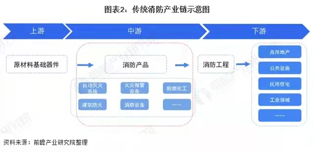 2、產(chǎn)業(yè)鏈剖析:解決傳統(tǒng)消防產(chǎn)業(yè)之間的銜接問題 在傳統(tǒng)消防行業(yè)產(chǎn)業(yè)鏈中,消防企業(yè)主要起到消防產(chǎn)品制造商的角色,提供自動(dòng)滅火系統(tǒng),火災(zāi)報(bào)警設(shè)備,阻燃化工,建筑防火,消防設(shè)備等產(chǎn)品,后續(xù)由消防工程專業(yè)施工企業(yè)負(fù)責(zé)協(xié)調(diào)建設(shè)單位,設(shè)計(jì)單位,完成消防工程的搭建。產(chǎn)業(yè)之間的銜接問題明顯:施工單位高度重視消防功能,忽視施工安裝質(zhì)量;產(chǎn)品標(biāo)準(zhǔn)銜接脫節(jié),檢測(cè)中心分工脫節(jié),設(shè)計(jì)不符合實(shí)際應(yīng)用場(chǎng)景等。 ![]() 智慧消防主要提供智能消防產(chǎn)品:自動(dòng)滅火系統(tǒng),火災(zāi)報(bào)警設(shè)備,應(yīng)急疏散系統(tǒng)等。后續(xù)消防工程的搭建轉(zhuǎn)變?yōu)橄到y(tǒng)解決方案,利用物聯(lián)網(wǎng)大數(shù)據(jù)完成遠(yuǎn)程監(jiān)控,隱患排查,應(yīng)急疏散等工作。新型產(chǎn)業(yè)鏈可以有效解決傳統(tǒng)消防產(chǎn)業(yè)之間的銜接問題,實(shí)現(xiàn)無死角區(qū)域的全面覆蓋,深刻感知各個(gè)消防系統(tǒng)之間相關(guān)聯(lián)的直接同步配合關(guān)系,也可以實(shí)現(xiàn)消防安全跨越地理邊界,并且有利于中高端消防企業(yè)的發(fā)展。擁有較強(qiáng)研發(fā)實(shí)力的公司跨界和科技公司合作,實(shí)現(xiàn)戰(zhàn)略轉(zhuǎn)型,帶動(dòng)消防產(chǎn)業(yè)升級(jí)。