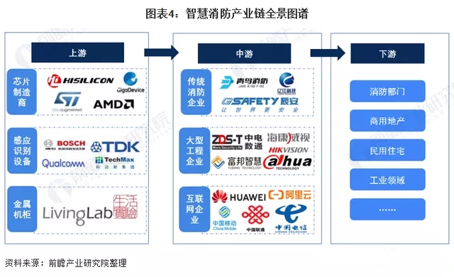從產(chǎn)業(yè)鏈生態(tài)來看,中國智慧消防行業(yè)產(chǎn)業(yè)鏈上游市場(chǎng)參與者包括數(shù)據(jù)算法提供商、芯片制造商、電子元器件制造商及金屬機(jī)柜加工商等,產(chǎn)業(yè)鏈中游環(huán)節(jié)主體為智慧消防平臺(tái)系統(tǒng)集成商,產(chǎn)業(yè)鏈下游為有消防需求的各行業(yè)。