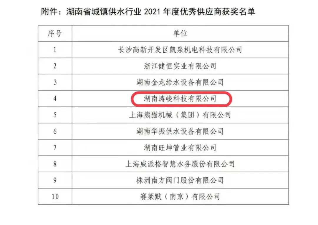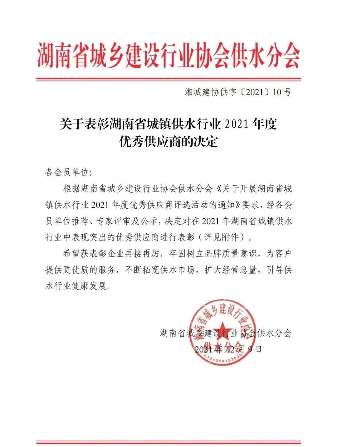 根據(jù)湖南省城鄉(xiāng)建設(shè)行業(yè)協(xié)會供水分會《關(guān)于開展湖南省城鎮(zhèn)供水行業(yè)2021年度優(yōu)秀供應(yīng)商評選活動的通知》要求,經(jīng)各會員單位推薦,專家評審及公示,決定對在2021年湖南省城鎮(zhèn)供水行業(yè)中表現(xiàn)突出的優(yōu)秀供應(yīng)商進(jìn)行表彰。